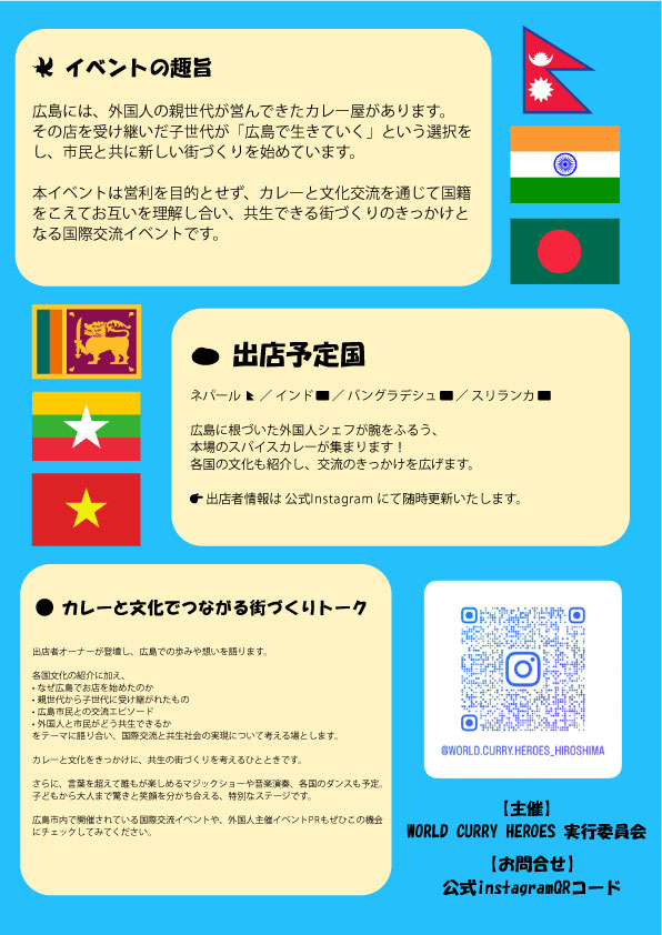主催 WORLD CURRY HEROSE 実行委員会 公式Instagram: https://www.instagram.com/world.curry.heroes_hiroshima?igsh=MTZ4bHM5cHU5M2N5ag%3D%3D&utm_source=qr