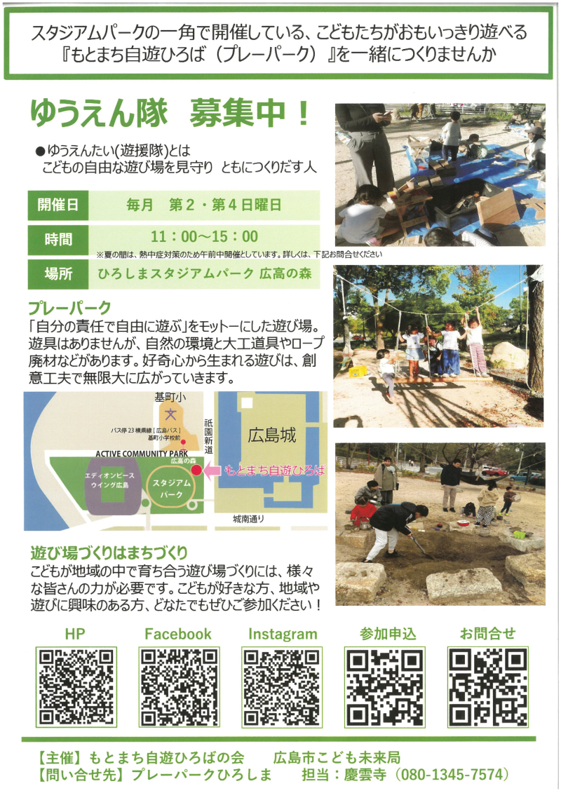 「もとまち自遊ひろば」の会は、子どもたちが地域でのびのび遊び育ち合える環境づくりを思い、広島市の冒険遊び場事業としてひろしまスタジアムパーク 広高の森で月2回開催「もとまち自遊ひろば(プレパーク)」を開催しています。