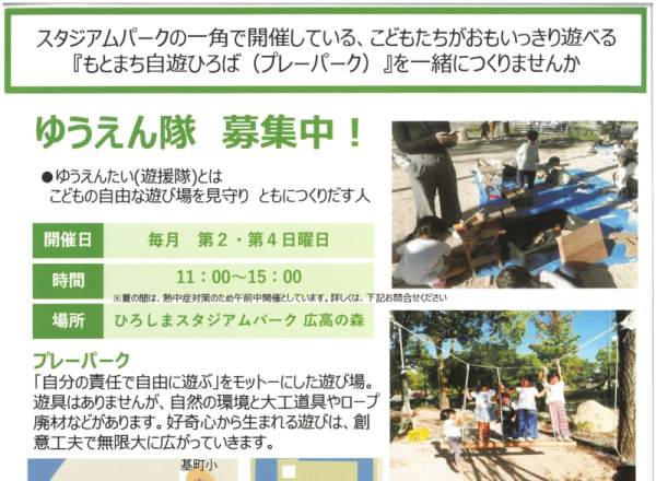 「もとまち自遊ひろば」の会は、子どもたちが地域でのびのび遊び育ち合える環境づくりを思い、広島市の冒険遊び場事業としてひろしまスタジアムパーク 広高の森で月2回開…