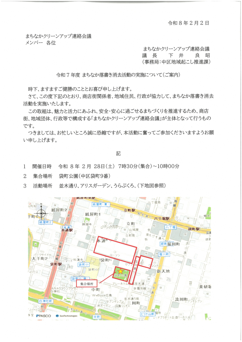 この取組は、魅力と活力にあふれ、安全・安心に過ごせるまちづくりを推進するため、商店街、地域団体、行政等で構成する「まちなかクリーンアップ連絡会議」が主体となって行うものです。