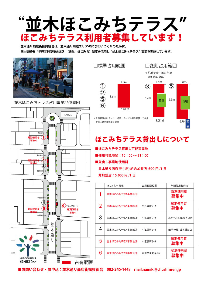 「歩行者利便増進道路制度」を活用し、広島市・道路占用許可「namiki food terrace」事業から並木通り周辺エリアのまちづくりに資する歩道空間利活用を目的とする「並木ほこみちテラス」事業へ事業を実施することとなりました。